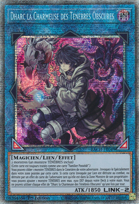 Vous pouvez cibler 1 monstre TÉNÈBRES dans le Cimetière de votre adversaire ; Invoquez-le Spécialement dans votre zone pointée par cette carte. Si cette carte Invoquée par Lien est détruite au combat, ou détruite par un effet de carte de l'adversaire tant qu'elle est dans la Zone Monstre de son propriétaire : vous pouvez ajouter 1 monstre TÉNÈBRES avec max. 1500 DEF depuis votre Deck à votre main. Vous ne pouvez utiliser chaque effet de "Dharc la Charmeuse des Ténèbres Obscures" qu'une fois par tour.