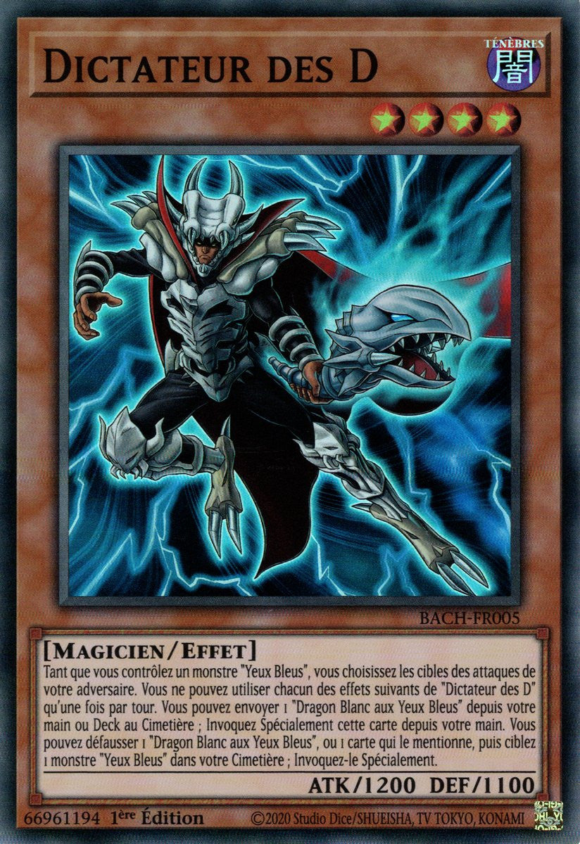 Tant que vous contrôlez un monstre "Yeux Bleus", vous choisissez les cibles des attaques de votre adversaire. Vous ne pouvez utiliser chacun des effets suivants de "Dictateur des D" qu'une fois par tour. Vous pouvez envoyer 1 "Dragon Blanc aux Yeux Bleus" depuis votre main ou Deck au Cimetière ; Invoquez Spécialement cette carte depuis votre main. Vous pouvez défausser 1 "Dragon Blanc aux Yeux Bleus", ou 1 carte qui le mentionne, puis ciblez 1 monstre "Yeux Bleus" dans votre Cimetière ; Invoquez-le Spécialement.