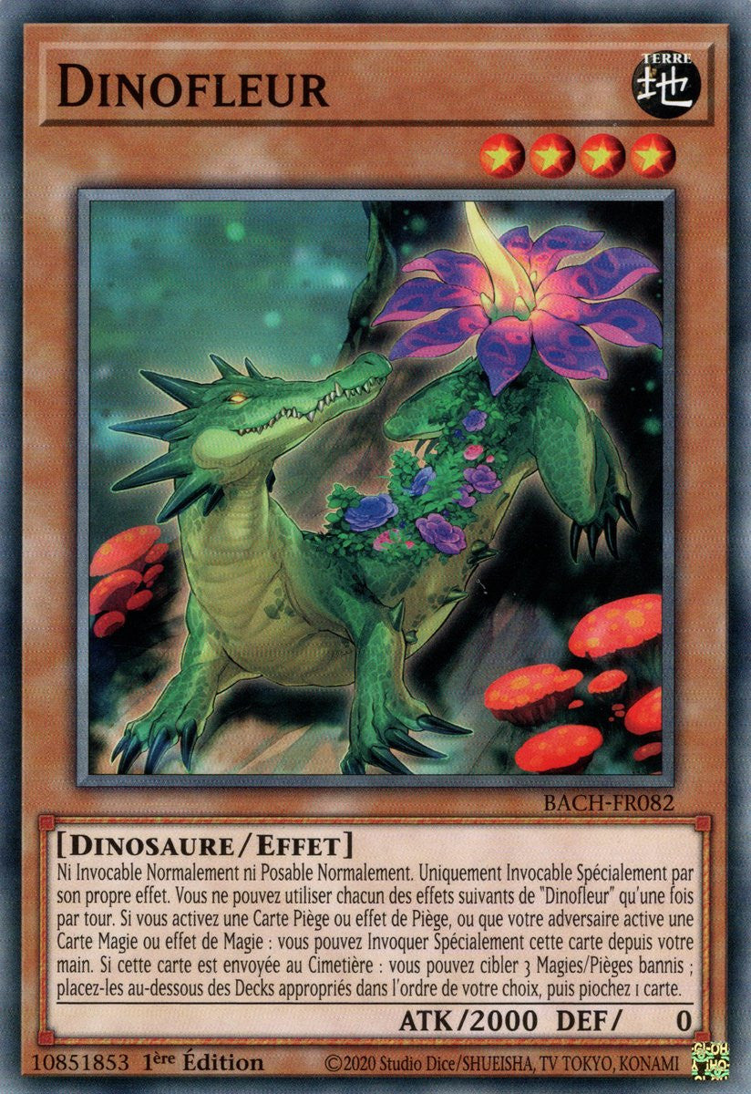 Ni Invocable Normalement ni Posable Normalement. Uniquement Invocable Spécialement par son propre effet. Vous ne pouvez utiliser chacun des effets suivants de "Dinofleur" qu'une fois par tour. Si vous activez une Carte Piège ou effet de Piège, ou que votre adversaire active une Carte Magie ou effet de Magie : vous pouvez Invoquer Spécialement cette carte depuis votre main. Si cette carte est envoyée au Cimetière : vous pouvez cibler 3 Magies/Pièges bannis ; placez-les au-dessous des Decks appropriés dans l'ordre de votre choix, puis piochez 1 carte.