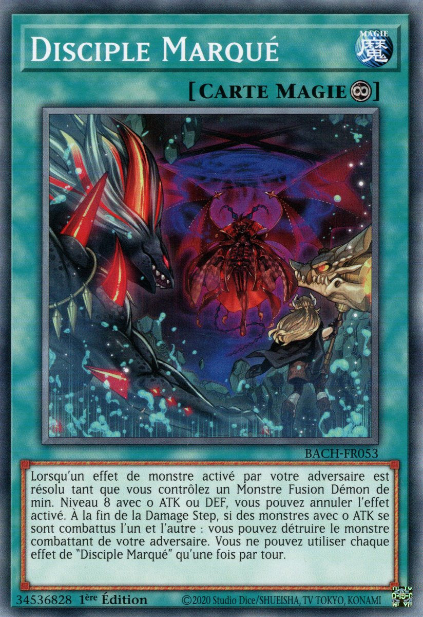 Lorsqu'un effet de monstre activé par votre adversaire est résolu tant que vous contrôlez un Monstre Fusion Démon de min. Niveau 8 avec 0 ATK ou DEF, vous pouvez annuler l'effet activé. À la fin de la Damage Step, si des monstres avec 0 ATK se sont combattus l'un et l'autre : vous pouvez détruire le monstre combattant de votre adversaire. Vous ne pouvez utiliser chaque effet de "Disciple Marqué" qu'une fois par tour.