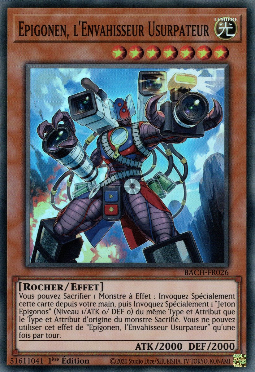 Vous pouvez Sacrifier 1 Monstre à Effet : Invoquez Spécialement cette carte depuis votre main, puis Invoquez Spécialement 1 "Jeton Epigonos" (Niveau 1/ATK 0/ DEF 0) du même Type et Attribut que le Type et Attribut d'origine du monstre Sacrifié. Vous ne pouvez utiliser cet effet de "Epigonen, l'Envahisseur Usurpateur" qu'une fois par tour.