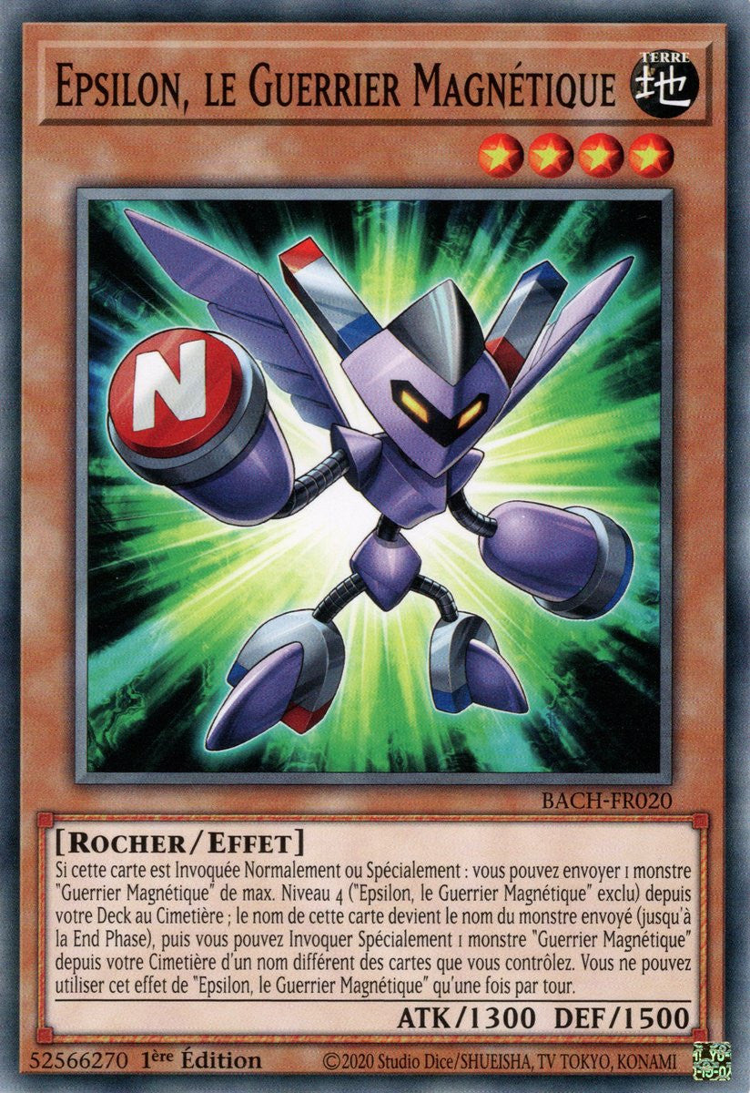 Si cette carte est Invoquée Normalement ou Spécialement : vous pouvez envoyer 1 monstre "Guerrier Magnétique" de max. Niveau 4 ("Epsilon, le Guerrier Magnétique" exclu) depuis votre Deck au Cimetière ; le nom de cette carte devient le nom du monstre envoyé (jusqu'à la End Phase), puis vous pouvez Invoquer Spécialement 1 monstre "Guerrier Magnétique" depuis votre Cimetière d'un nom différent des cartes que vous contrôlez. Vous ne pouvez utiliser cet effet de "Epsilon, le Guerrier Magnétique" qu'une fois par tour.
