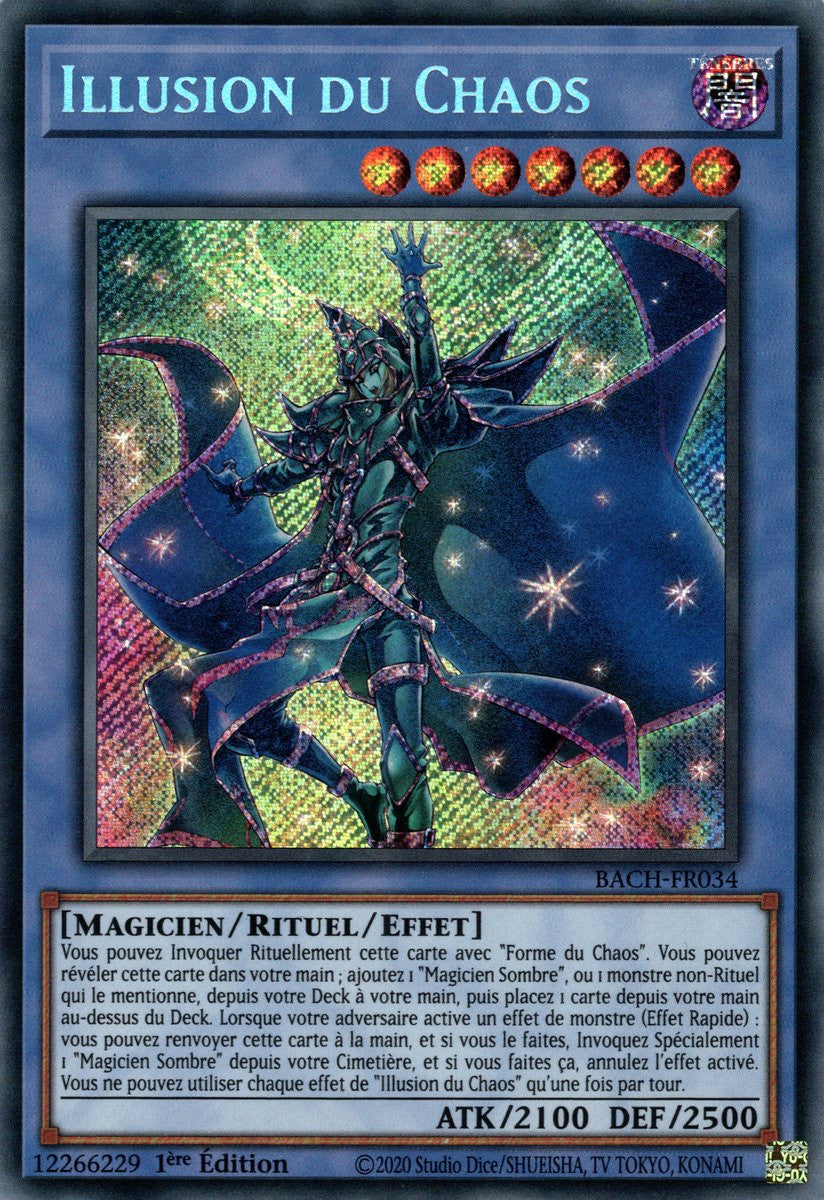 Vous pouvez Invoquer Rituellement cette carte avec "Forme du Chaos". Vous pouvez révéler cette carte dans votre main ; ajoutez 1 "Magicien Sombre", ou 1 monstre non-Rituel qui le mentionne, depuis votre Deck à votre main, puis placez 1 carte depuis votre main au-dessus du Deck. Lorsque votre adversaire active un effet de monstre (Effet Rapide) : vous pouvez renvoyer cette carte à la main, et si vous le faites, Invoquez Spécialement 1 "Magicien Sombre" depuis votre Cimetière, et si vous faites ça, annulez l'effet activé. Vous ne pouvez utiliser chaque effet de "Illusion du Chaos" qu'une fois par tour.