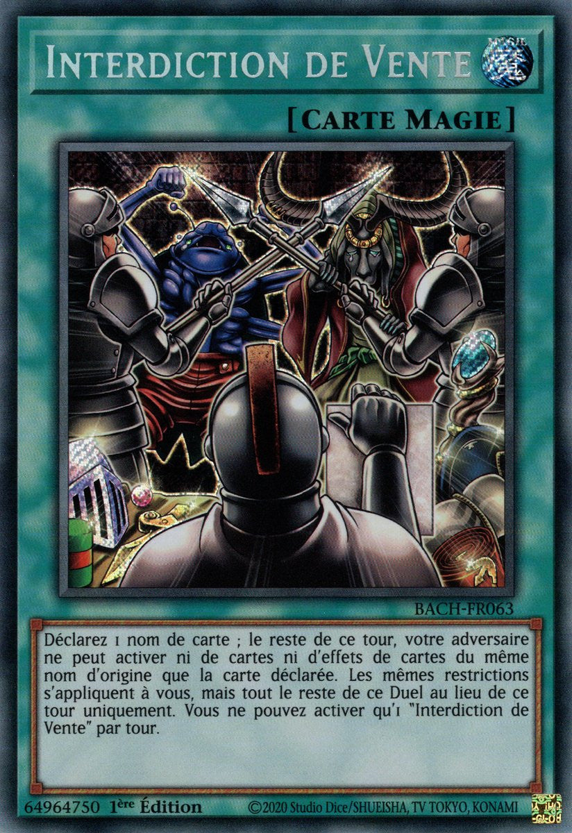 Déclarez 1 nom de carte ; le reste de ce tour, votre adversaire ne peut activer ni de cartes ni d'effets de cartes du même nom d'origine que la carte déclarée. Les mêmes restrictions s'appliquent à vous, mais tout le reste de ce Duel au lieu de ce tour uniquement. Vous ne pouvez activer qu'1 "Interdiction de Vente" par tour.