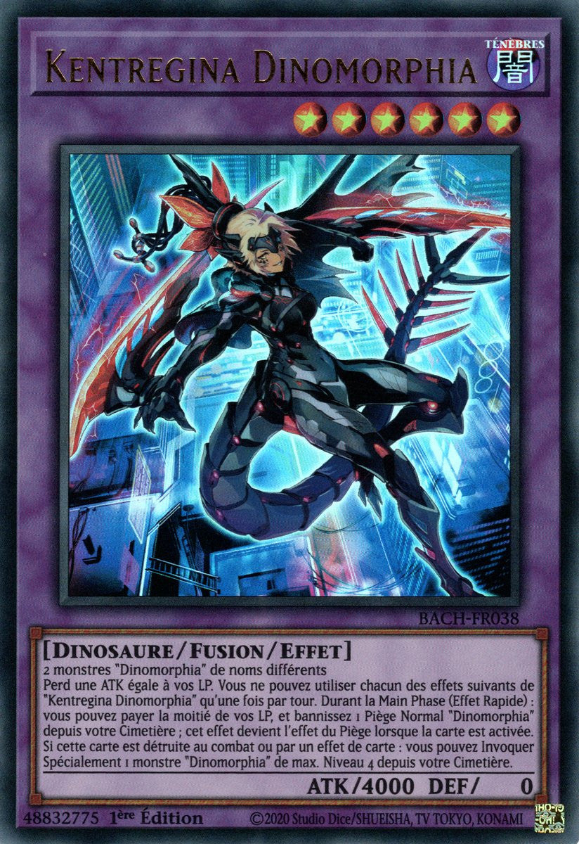 Perd une ATK égale à vos LP. Vous ne pouvez utiliser chacun des effets suivants de "Kentregina Dinomorphia" qu'une fois par tour. Durant la Main Phase (Effet Rapide) : vous pouvez payer la moitié de vos LP, et bannissez 1 Piège Normal "Dinomorphia" depuis votre Cimetière ; cet effet devient l'effet du Piège lorsque la carte est activée. Si cette carte est détruite au combat ou par un effet de carte : vous pouvez Invoquer Spécialement 1 monstre "Dinomorphia" de max. Niveau 4 depuis votre Cimetière.