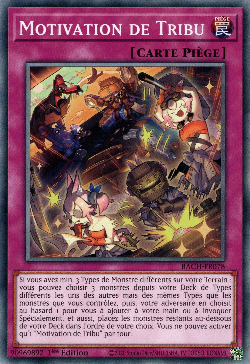 Si vous avez min. 3 Types de Monstre différents sur votre Terrain : vous pouvez choisir 3 monstres depuis votre Deck de Types différents les uns des autres mais des mêmes Types que les monstres que vous contrôlez, puis, votre adversaire en choisit au hasard 1 pour vous à ajouter à votre main ou à Invoquer Spécialement, et aussi, placez les monstres restants au-dessous de votre Deck dans l'ordre de votre choix. Vous ne pouvez activer qu'1 "Motivation de Tribu" par tour.