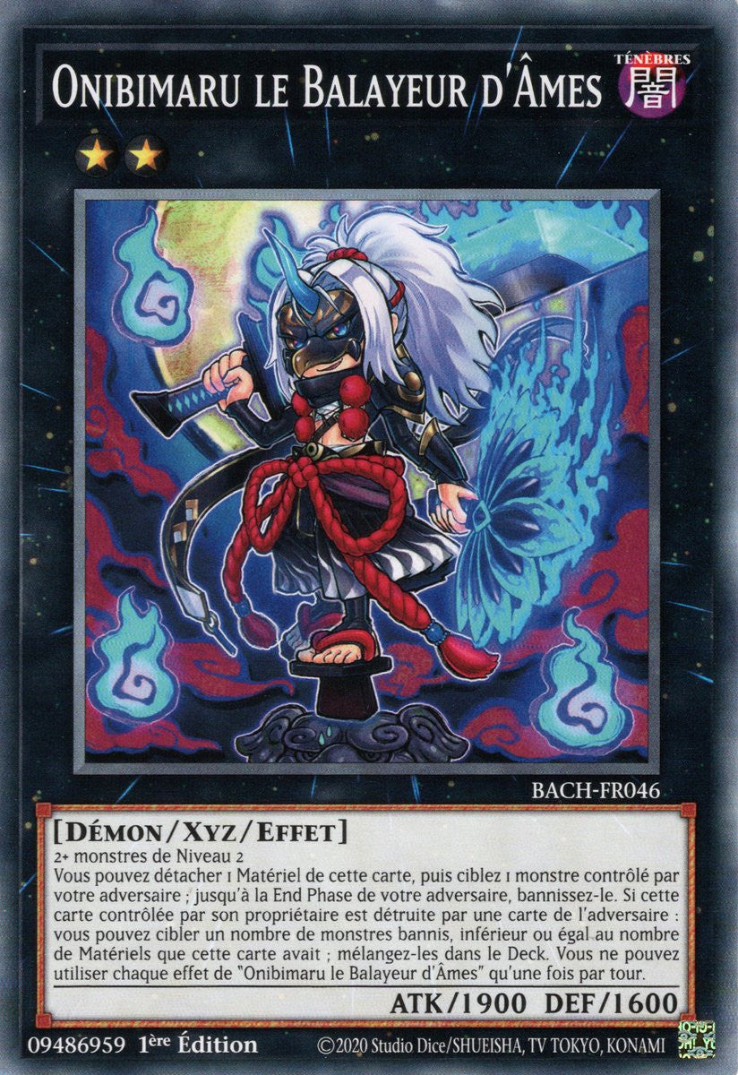 Vous pouvez détacher 1 Matériel de cette carte, puis ciblez 1 monstre contrôlé par votre adversaire ; jusqu'à la End Phase de votre adversaire, bannissez-le. Si cette carte contrôlée par son propriétaire est détruite par une carte de l'adversaire : vous pouvez cibler un nombre de monstres bannis, inférieur ou égal au nombre de Matériels que cette carte avait ; mélangez-les dans le Deck. Vous ne pouvez utiliser chaque effet de "Onibimaru le Balayeur d'Âmes" qu'une fois par tour.