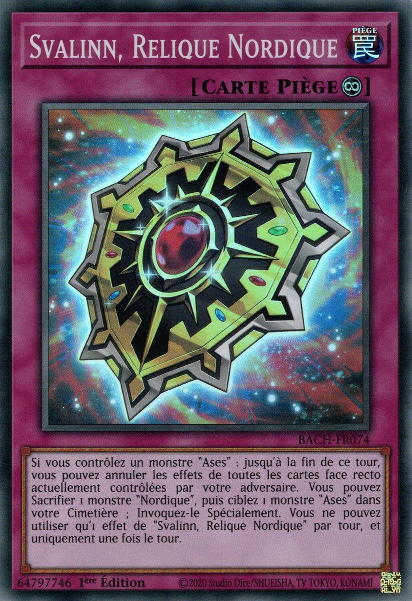 Si vous contrôlez un monstre "Ases" : jusqu'à la fin de ce tour, vous pouvez annuler les effets de toutes les cartes face recto actuellement contrôlées par votre adversaire. Vous pouvez Sacrifier 1 monstre "Nordique", puis ciblez 1 monstre "Ases" dans votre Cimetière ; Invoquez-le Spécialement. Vous ne pouvez utiliser qu'1 effet de "Svalinn, Relique Nordique" par tour, et uniquement une fois le tour.
