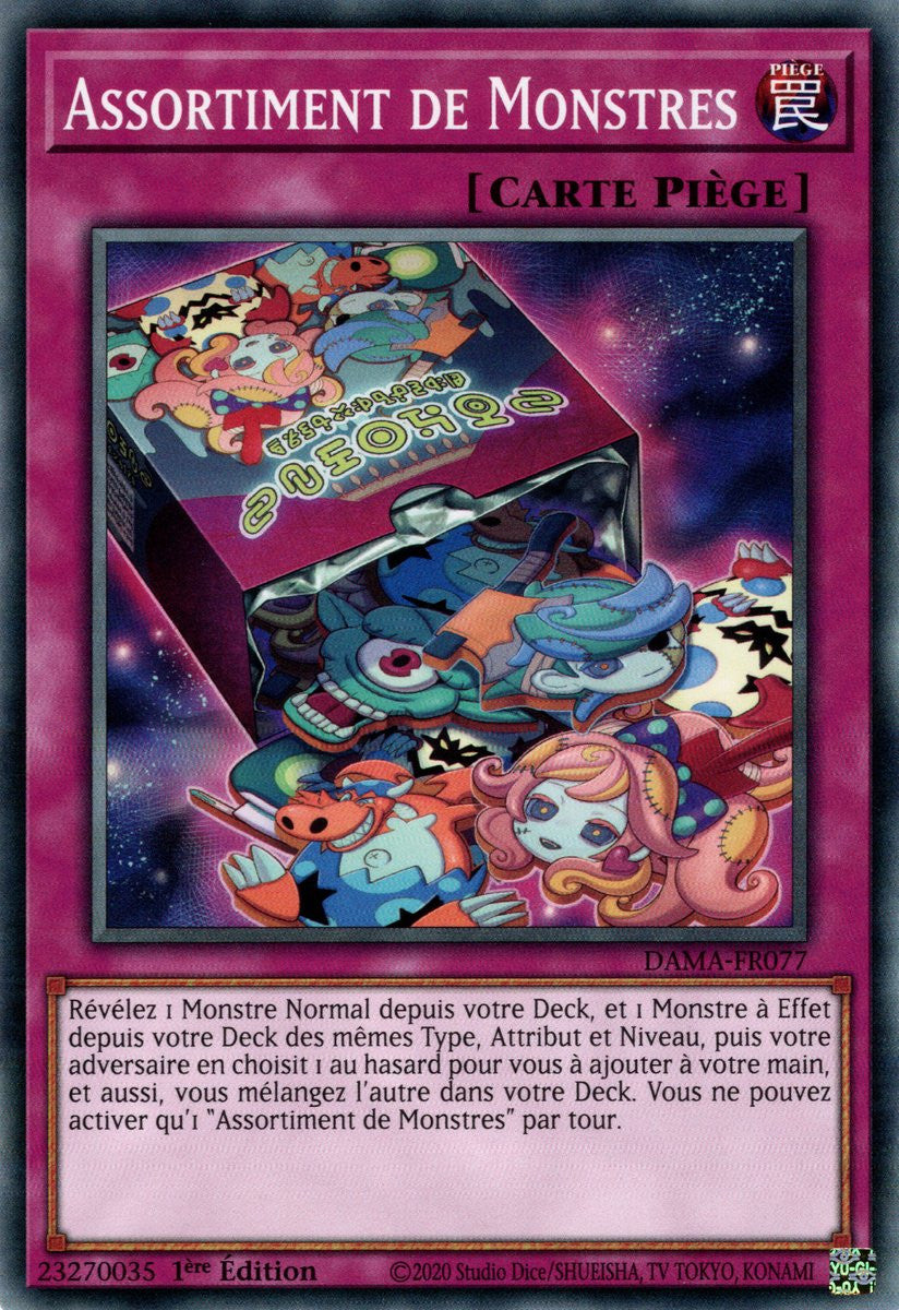 Révélez 1 Monstre Normal depuis votre Deck, et 1 Monstre à Effet depuis votre Deck des mêmes Type, Attribut et Niveau, puis votre adversaire en choisit 1 au hasard pour vous à ajouter à votre main, et aussi, vous mélangez l'autre dans votre Deck. Vous ne pouvez activer qu'1 "Assortiment de Monstres" par tour.