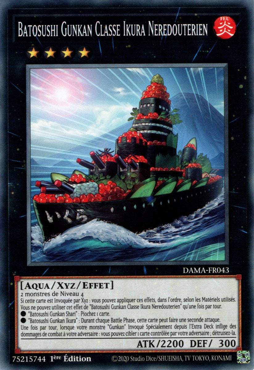 Si cette carte est Invoquée par Xyz : vous pouvez appliquer ces effets, dans l'ordre, selon les Matériels utilisés. Vous ne pouvez utiliser cet effet de "Batosushi Gunkan Classe Ikura Neredouterien" qu'une fois par tour.