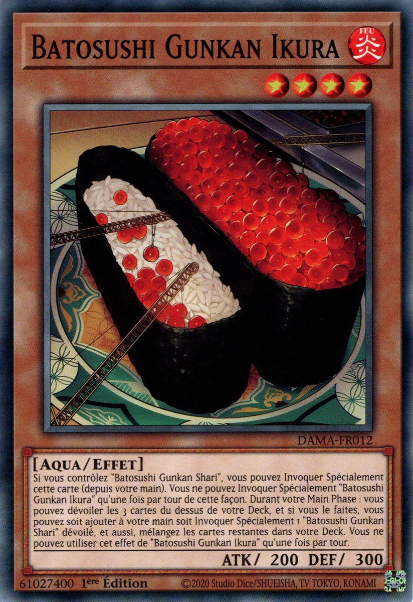 Si vous contrôlez "Batosushi Gunkan Shari", vous pouvez Invoquer Spécialement cette carte (depuis votre main). Vous ne pouvez Invoquer Spécialement "Batosushi Gunkan Ikura" qu'une fois par tour de cette façon. Durant votre Main Phase : vous pouvez dévoiler les 3 cartes du dessus de votre Deck, et si vous le faites, vous pouvez soit ajouter à votre main soit Invoquer Spécialement 1 "Batosushi Gunkan Shari" dévoilé, et aussi, mélangez les cartes restantes dans votre Deck. Vous ne pouvez utiliser cet effet de "Batosushi Gunkan Ikura" qu'une fois par tour.