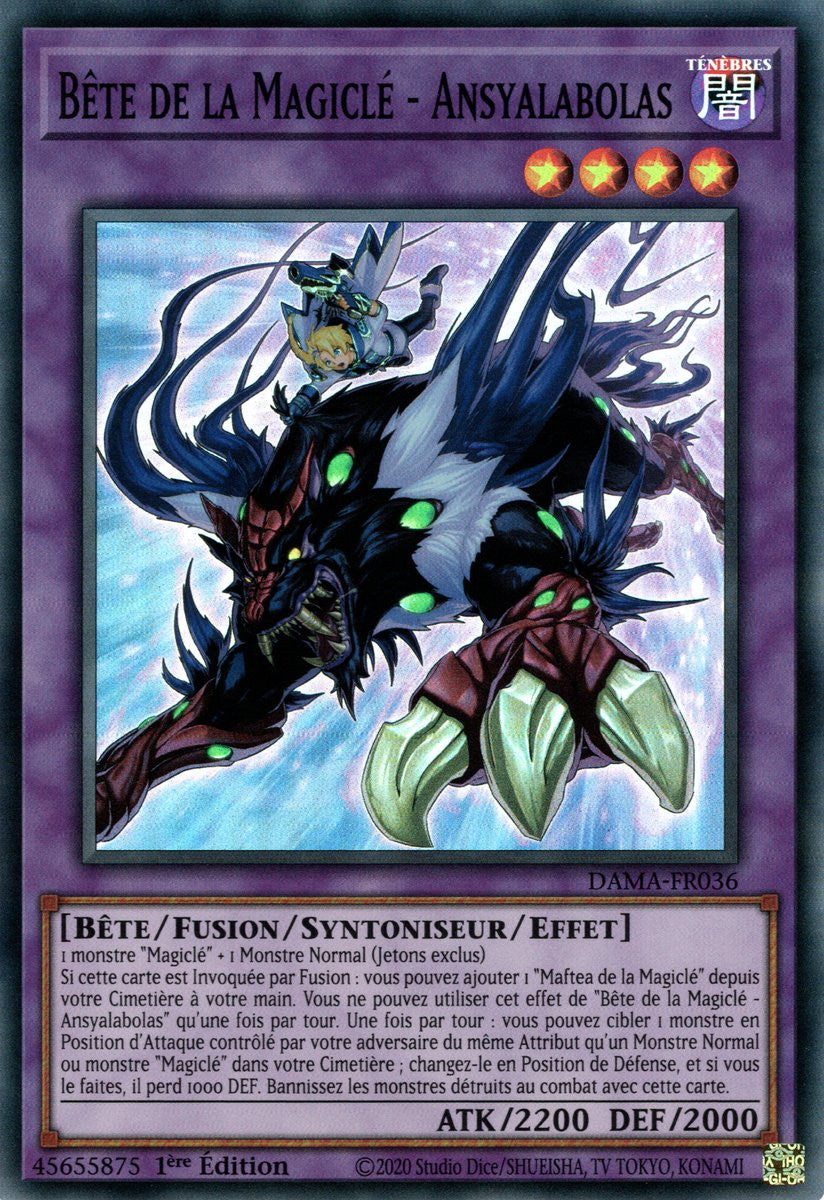 Si cette carte est Invoquée par Fusion : vous pouvez ajouter 1 "Maftea de la Magiclé" depuis votre Cimetière à votre main. Vous ne pouvez utiliser cet effet de "Bête de la Magiclé - Ansyalabolas" qu'une fois par tour. Une fois par tour : vous pouvez cibler 1 monstre en Position d'Attaque contrôlé par votre adversaire du même Attribut qu'un Monstre Normal ou monstre "Magiclé" dans votre Cimetière ; changez-le en Position de Défense, et si vous le faites, il perd 1000 DEF. Bannissez les monstres détruits au combat avec cette carte.