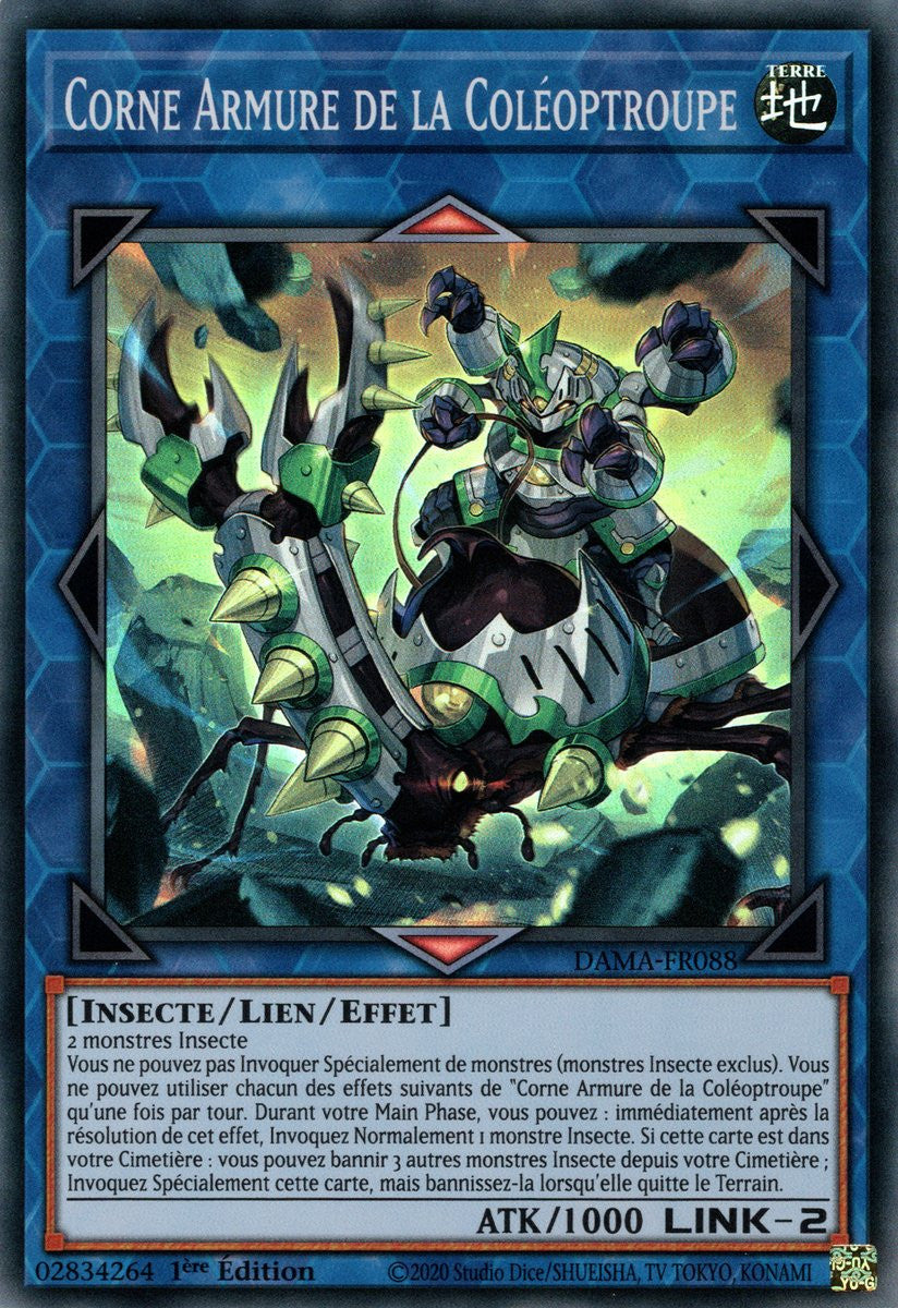 Vous ne pouvez pas Invoquer Spécialement de monstres (monstres Insecte exclus). Vous ne pouvez utiliser chacun des effets suivants de "Corne Armure de la Coléoptroupe" qu'une fois par tour. Durant votre Main Phase, vous pouvez : immédiatement après la résolution de cet effet, Invoquez Normalement 1 monstre Insecte. Si cette carte est dans votre Cimetière : vous pouvez bannir 3 autres monstres Insecte depuis votre Cimetière ; Invoquez Spécialement cette carte, mais bannissez-la lorsqu'elle quitte le Terrain.