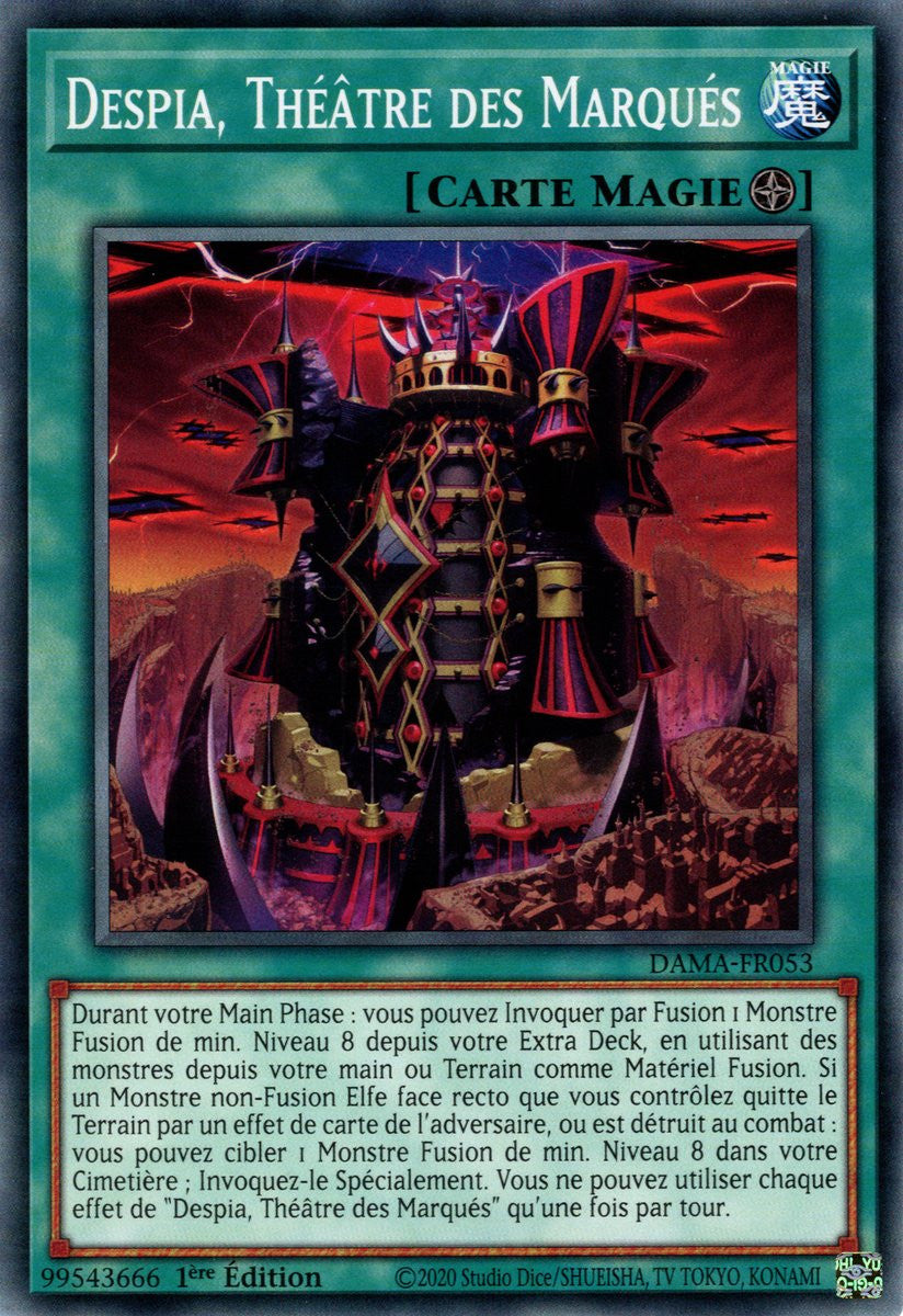Durant votre Main Phase : vous pouvez Invoquer par Fusion 1 Monstre Fusion de min. Niveau 8 depuis votre Extra Deck, en utilisant des monstres depuis votre main ou Terrain comme Matériel Fusion. Si un Monstre non-Fusion Elfe face recto que vous contrôlez quitte le Terrain par un effet de carte de l'adversaire, ou est détruit au combat : vous pouvez cibler 1 Monstre Fusion de min. Niveau 8 dans votre Cimetière ; Invoquez-le Spécialement. Vous ne pouvez utiliser chaque effet de "Despia, Théâtre des Marqués" qu'une fois par tour.