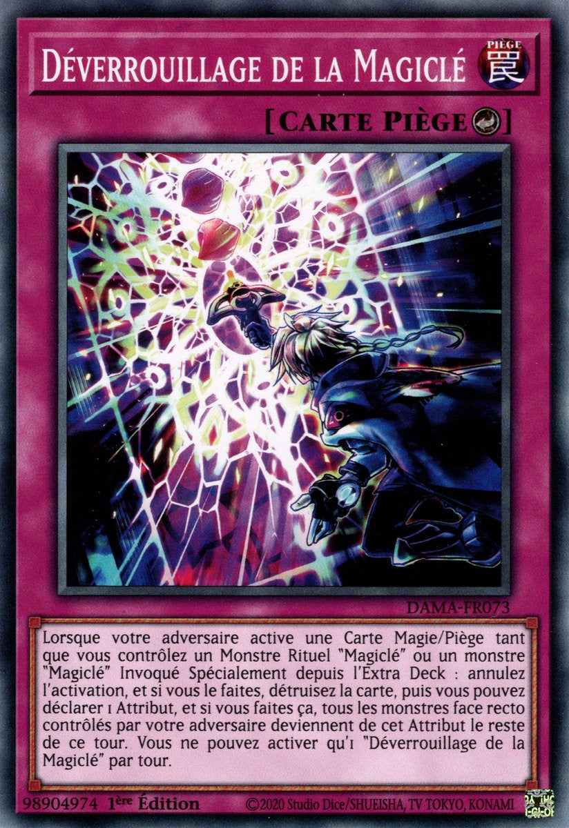 Lorsque votre adversaire active une Carte Magie/Piège tant que vous contrôlez un Monstre Rituel "Magiclé" ou un monstre "Magiclé" Invoqué Spécialement depuis l'Extra Deck : annulez l'activation, et si vous le faites, détruisez la carte, puis vous pouvez déclarer 1 Attribut, et si vous faites ça, tous les monstres face recto contrôlés par votre adversaire deviennent de cet Attribut le reste de ce tour. Vous ne pouvez activer qu'1 "Déverrouillage de la Magiclé" par tour.