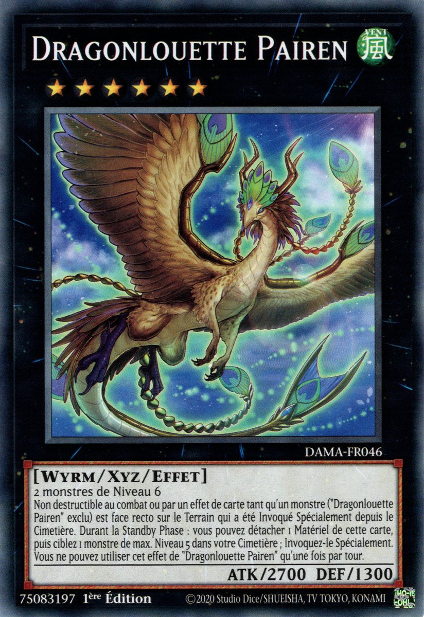 Non destructible au combat ou par un effet de carte tant qu'un monstre ("Dragonlouette Pairen" exclu) est face recto sur le Terrain qui a été Invoqué Spécialement depuis le Cimetière. Durant la Standby Phase : vous pouvez détacher 1 Matériel de cette carte, puis ciblez 1 monstre de max. Niveau 5 dans votre Cimetière ; Invoquez-le Spécialement. Vous ne pouvez utiliser cet effet de "Dragonlouette Pairen" qu'une fois par tour.
