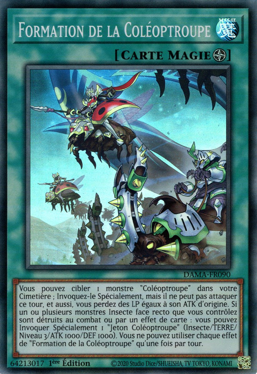 Vous pouvez cibler 1 monstre "Coléoptroupe" dans votre Cimetière ; Invoquez-le Spécialement, mais il ne peut pas attaquer ce tour, et aussi, vous perdez des LP égaux à son ATK d'origine. Si un ou plusieurs monstres Insecte face recto que vous contrôlez sont détruits au combat ou par un effet de carte : vous pouvez Invoquer Spécialement 1 "Jeton Coléoptroupe" (Insecte/TERRE/Niveau 3/ATK 1000/DEF 1000). Vous ne pouvez utiliser chaque effet de "Formation de la Coléoptroupe" qu'une fois par tour.