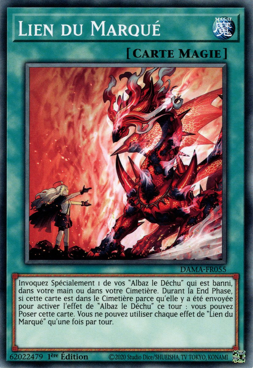 Invoquez Spécialement 1 de vos "Albaz le Déchu" qui est banni, dans votre main ou dans votre Cimetière. Durant la End Phase, si cette carte est dans le Cimetière parce qu'elle y a été envoyée pour activer l'effet de "Albaz le Déchu" ce tour : vous pouvez Poser cette carte. Vous ne pouvez utiliser chaque effet de "Lien du Marqué" qu'une fois par tour.