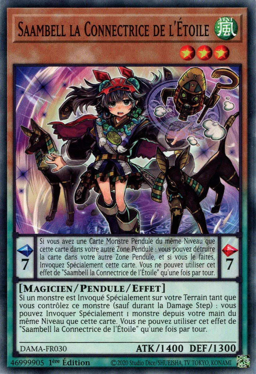 7 Si vous avez une Carte Monstre Pendule du même Niveau que cette carte dans votre autre Zone Pendule : vous pouvez détruire la carte dans votre autre Zone Pendule, et si vous le faites, Invoquez Spécialement cette carte. Vous ne pouvez utiliser cet effet de "Saambell la Connectrice de l'Étoile" qu'une fois par tour.Si un monstre est Invoqué Spécialement sur votre Terrain tant que vous contrôlez ce monstre (sauf durant la Damage Step) : vous pouvez Invoquer Spécialement 1 monstre depuis votre main du même Niveau que cette carte. Vous ne pouvez utiliser cet effet de "Saambell la Connectrice de l'Étoile" qu'une fois par tour.