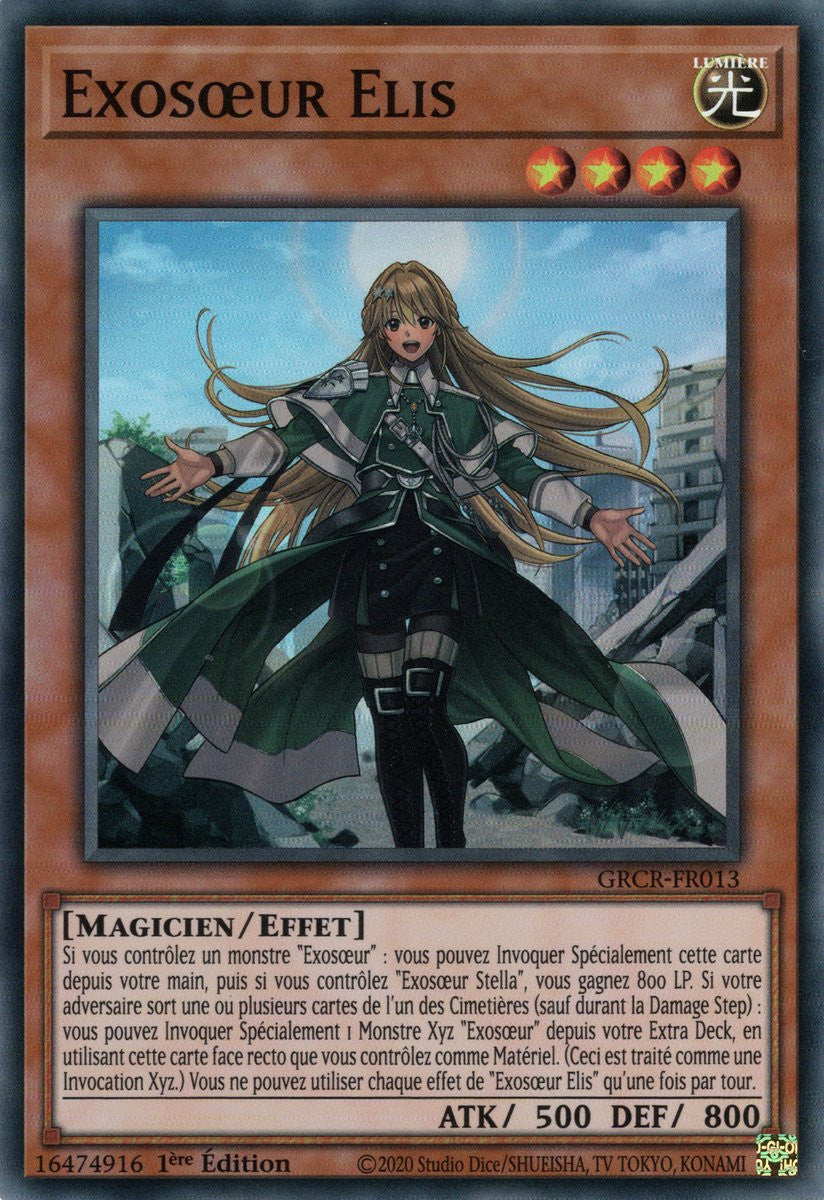 Si vous contrôlez un monstre "Exosœur" : vous pouvez Invoquer Spécialement cette carte depuis votre main, puis si vous contrôlez "Exosœur Stella", vous gagnez 800 LP. Si votre adversaire sort une ou plusieurs cartes de l'un des Cimetières (sauf durant la Damage Step) : vous pouvez Invoquer Spécialement 1 Monstre Xyz "Exosœur" depuis votre Extra Deck, en utilisant cette carte face recto que vous contrôlez comme Matériel. (Ceci est traité comme une Invocation Xyz.) Vous ne pouvez utiliser chaque effet de "Exosœur Elis" qu'une fois par tour.