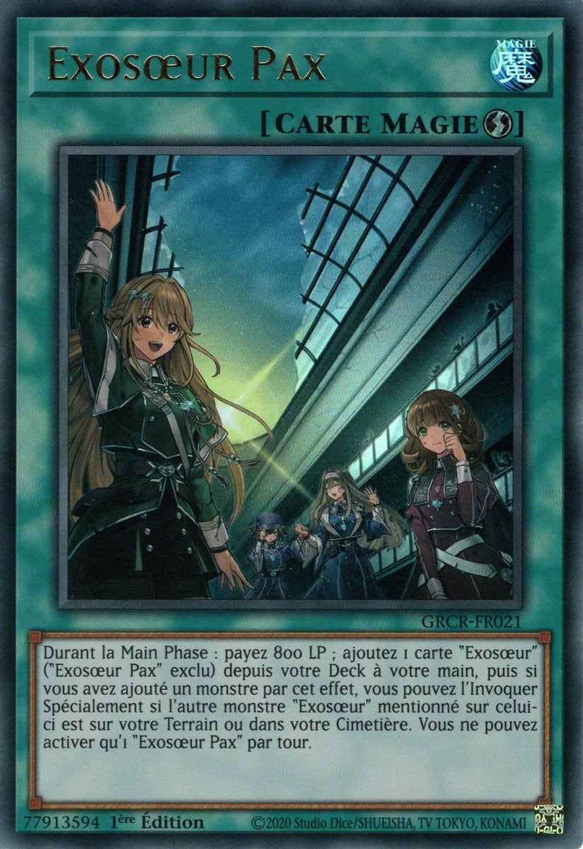 Durant la Main Phase : payez 800 LP ; ajoutez 1 carte "Exosœur" ("Exosœur Pax" exclu) depuis votre Deck à votre main, puis si vous avez ajouté un monstre par cet effet, vous pouvez l'Invoquer Spécialement si l'autre monstre "Exosœur" mentionné sur celui-ci est sur votre Terrain ou dans votre Cimetière. Vous ne pouvez activer qu'1 "Exosœur Pax" par tour.