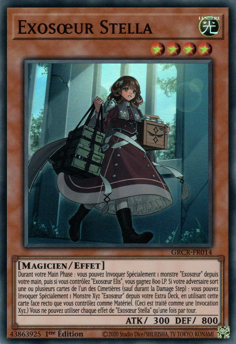 Durant votre Main Phase : vous pouvez Invoquer Spécialement 1 monstre "Exosœur" depuis votre main, puis si vous contrôlez "Exosœur Elis", vous gagnez 800 LP. Si votre adversaire sort une ou plusieurs cartes de l'un des Cimetières (sauf durant la Damage Step) : vous pouvez Invoquer Spécialement 1 Monstre Xyz "Exosœur" depuis votre Extra Deck, en utilisant cette carte face recto que vous contrôlez comme Matériel. (Ceci est traité comme une Invocation Xyz.) Vous ne pouvez utiliser chaque effet de "Exosœur Stella" qu'une fois par tour.