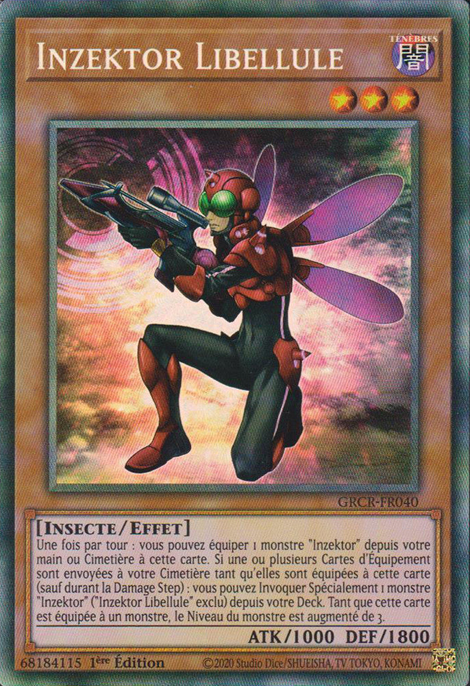 Une fois par tour : vous pouvez équiper 1 monstre "Inzektor" depuis votre main ou Cimetière à cette carte. Si une ou plusieurs Cartes d'Équipement sont envoyées à votre Cimetière tant qu'elles sont équipées à cette carte (sauf durant la Damage Step) : vous pouvez Invoquer Spécialement 1 monstre "Inzektor" ("Inzektor Libellule" exclu) depuis votre Deck. Tant que cette carte est équipée à un monstre, le Niveau du monstre est augmenté de 3.