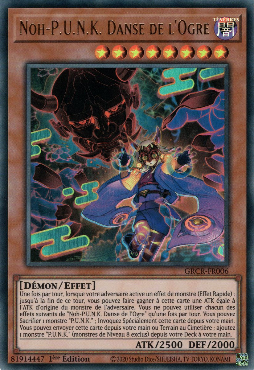Une fois par tour, lorsque votre adversaire active un effet de monstre (Effet Rapide) : jusqu'à la fin de ce tour, vous pouvez faire gagner à cette carte une ATK égale à l'ATK d'origine du monstre de l'adversaire. Vous ne pouvez utiliser chacun des effets suivants de "Noh-P.U.N.K. Danse de l'Ogre" qu'une fois par tour. Vous pouvez Sacrifier 1 monstre "P.U.N.K." ; Invoquez Spécialement cette carte depuis votre main. Vous pouvez envoyer cette carte depuis votre main ou Terrain au Cimetière ; ajoutez 1 monstre "P.U.N.K." (monstres de Niveau 8 exclus) depuis votre Deck à votre main.