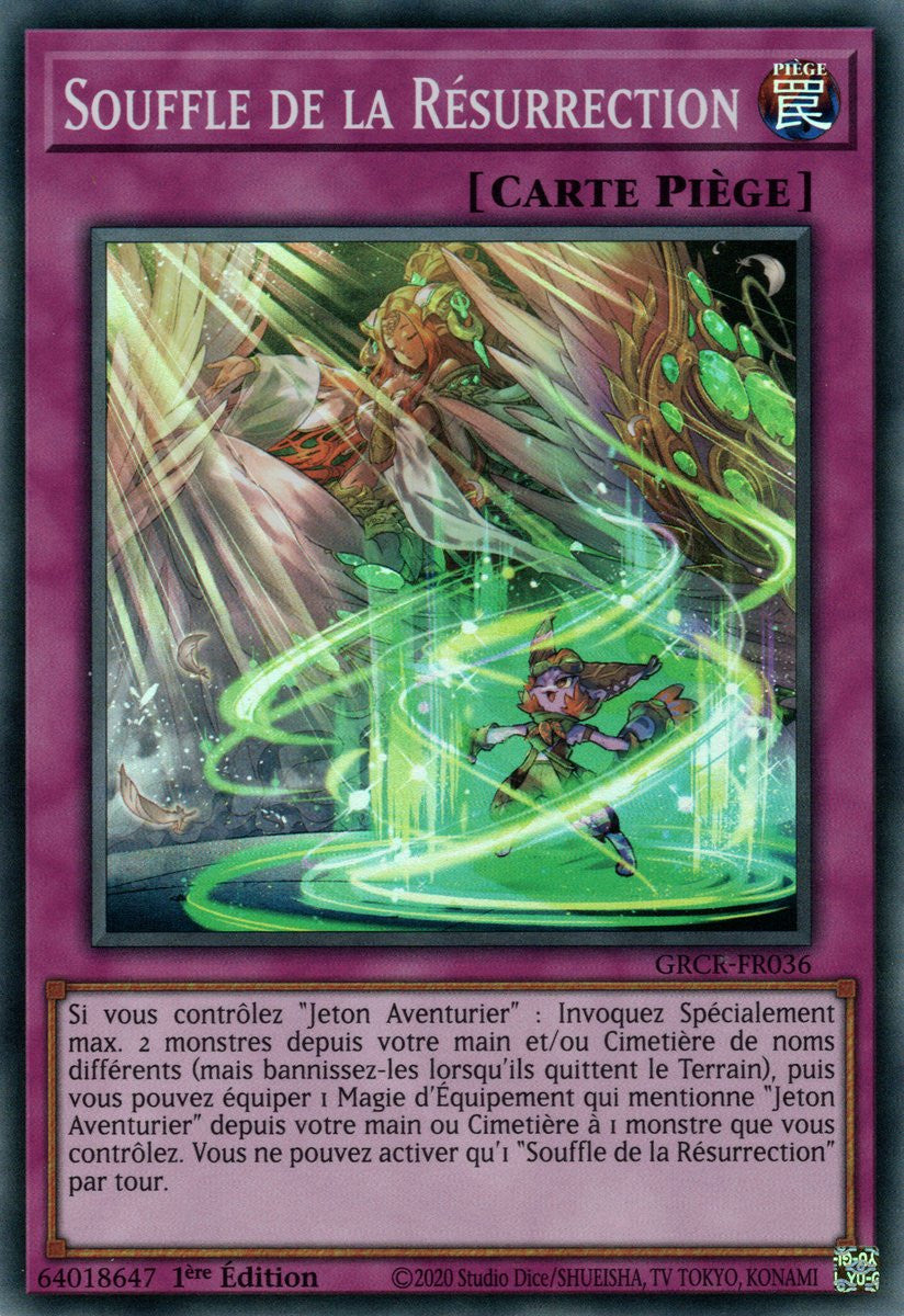 Si vous contrôlez "Jeton Aventurier" : Invoquez Spécialement max. 2 monstres depuis votre main et/ou Cimetière de noms différents (mais bannissez-les lorsqu'ils quittent le Terrain), puis vous pouvez équiper 1 Magie d'Équipement qui mentionne "Jeton Aventurier" depuis votre main ou Cimetière à 1 monstre que vous contrôlez. Vous ne pouvez activer qu'1 "Souffle de la Résurrection" par tour.