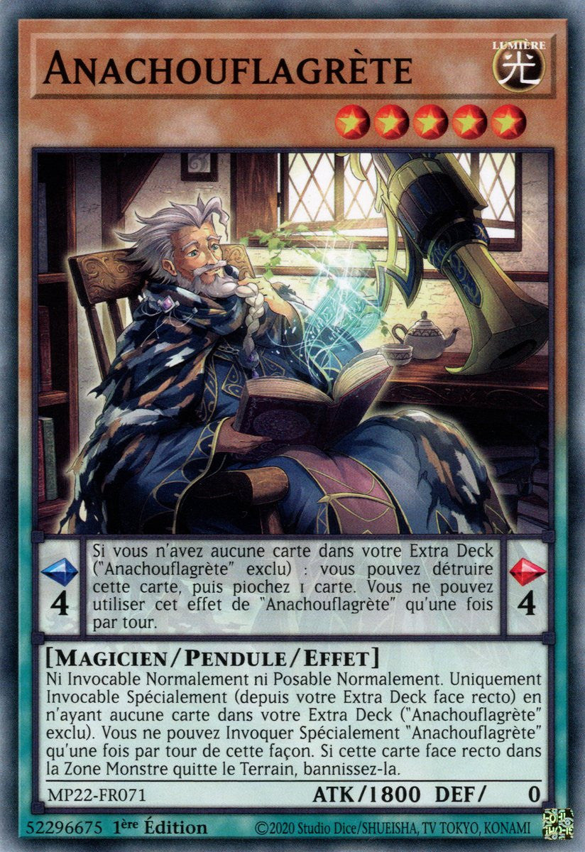 Échelle P 4Si vous n'avez aucune carte dans votre Extra Deck ("Anachouflagrète" exclu) : vous pouvez détruire cette carte, puis piochez 1 carte. Vous ne pouvez utiliser cet effet de "Anachouflagrète" qu'une fois par tour.Ni Invocable Normalement ni Posable Normalement. Uniquement Invocable Spécialement (depuis votre Extra Deck face recto) en n'ayant aucune carte dans votre Extra Deck ("Anachouflagrète" exclu). Vous ne pouvez Invoquer Spécialement "Anachouflagrète" qu'une fois par tour de cette façon. Si cette carte face recto dans la Zone Monstre quitte le Terrain, bannissez-la.