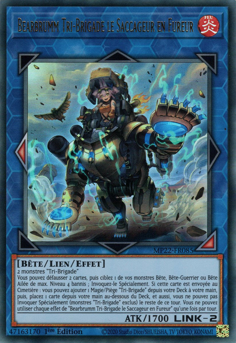 Vous pouvez défausser 2 cartes, puis ciblez 1 de vos monstres Bête, Bête-Guerrier ou Bête Ailée de max. Niveau 4 bannis ; Invoquez-le Spécialement. Si cette carte est envoyée au Cimetière : vous pouvez ajouter 1 Magie/Piège "Tri-Brigade" depuis votre Deck à votre main, puis, placez 1 carte depuis votre main au-dessous du Deck, et aussi, vous ne pouvez pas Invoquer Spécialement (monstres "Tri-Brigade" exclus) le reste de ce tour. Vous ne pouvez utiliser chaque effet de "Bearbrumm Tri-Brigade le Saccageur en Fureur" qu'une fois par tour.