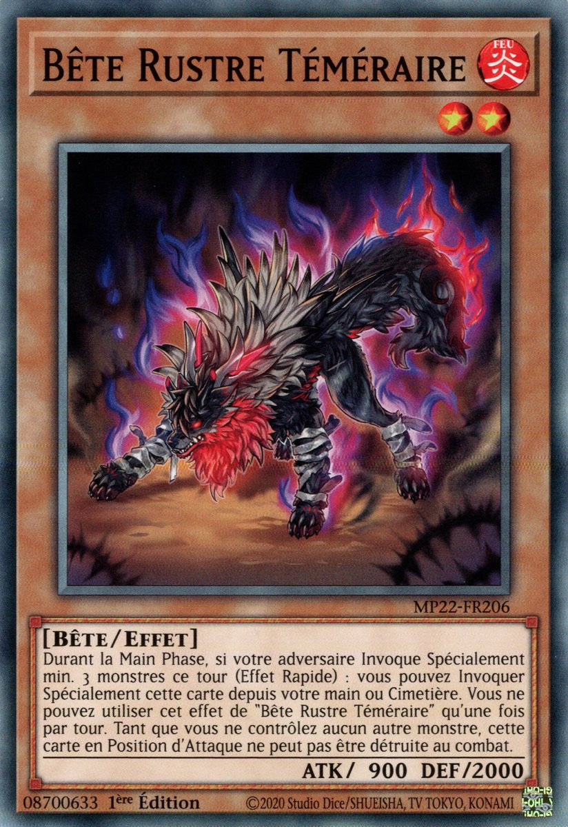 Durant la Main Phase, si votre adversaire Invoque Spécialement min. 3 monstres ce tour (Effet Rapide) : vous pouvez Invoquer Spécialement cette carte depuis votre main ou Cimetière. Vous ne pouvez utiliser cet effet de "Bête Rustre Téméraire" qu'une fois par tour. Tant que vous ne contrôlez aucun autre monstre, cette carte en Position d'Attaque ne peut pas être détruite au combat.