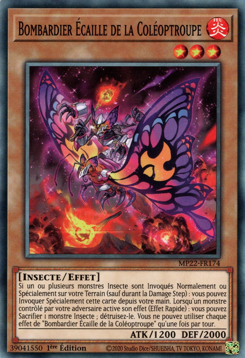 Si un ou plusieurs monstres Insecte sont Invoqués Normalement ou Spécialement sur votre Terrain (sauf durant la Damage Step) : vous pouvez Invoquer Spécialement cette carte depuis votre main. Lorsqu'un monstre contrôlé par votre adversaire active son effet (Effet Rapide) : vous pouvez Sacrifier 1 monstre Insecte ; détruisez-le. Vous ne pouvez utiliser chaque effet de "Bombardier Écaille de la Coléoptroupe" qu'une fois par tour.