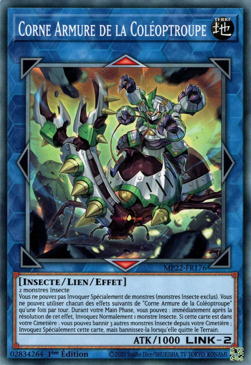 Vous ne pouvez pas Invoquer Spécialement de monstres (monstres Insecte exclus). Vous ne pouvez utiliser chacun des effets suivants de "Corne Armure de la Coléoptroupe" qu'une fois par tour. Durant votre Main Phase, vous pouvez : immédiatement après la résolution de cet effet, Invoquez Normalement 1 monstre Insecte. Si cette carte est dans votre Cimetière : vous pouvez bannir 3 autres monstres Insecte depuis votre Cimetière ; Invoquez Spécialement cette carte, mais bannissez-la lorsqu'elle quitte le Terrain.