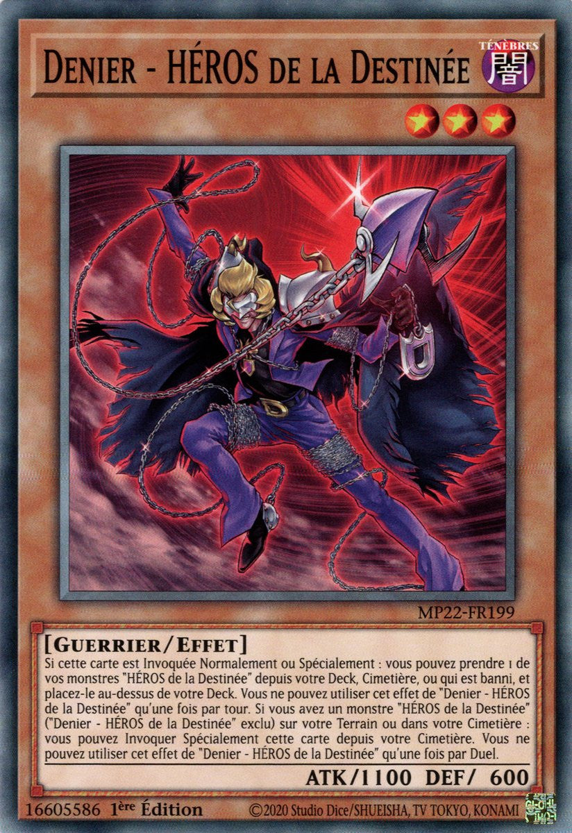 Si cette carte est Invoquée Normalement ou Spécialement : vous pouvez prendre 1 de vos monstres "HÉROS de la Destinée" depuis votre Deck, Cimetière, ou qui est banni, et placez-le au-dessus de votre Deck. Vous ne pouvez utiliser cet effet de "Denier - HÉROS de la Destinée" qu'une fois par tour. Si vous avez un monstre "HÉROS de la Destinée" ("Denier - HÉROS de la Destinée" exclu) sur votre Terrain ou dans votre Cimetière : vous pouvez Invoquer Spécialement cette carte depuis votre Cimetière. Vous ne pouvez utiliser cet effet de "Denier - HÉROS de la Destinée" qu'une fois par Duel.