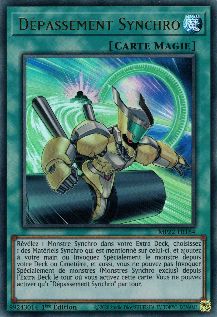 Révélez 1 Monstre Synchro dans votre Extra Deck, choisissez 1 des Matériels Synchro qui est mentionné sur celui-ci, et ajoutez à votre main ou Invoquez Spécialement le monstre depuis votre Deck ou Cimetière, et aussi, vous ne pouvez pas Invoquer Spécialement de monstres (Monstres Synchro exclus) depuis l'Extra Deck le tour où vous activez cette carte. Vous ne pouvez activer qu'1 "Dépassement Synchro" par tour.