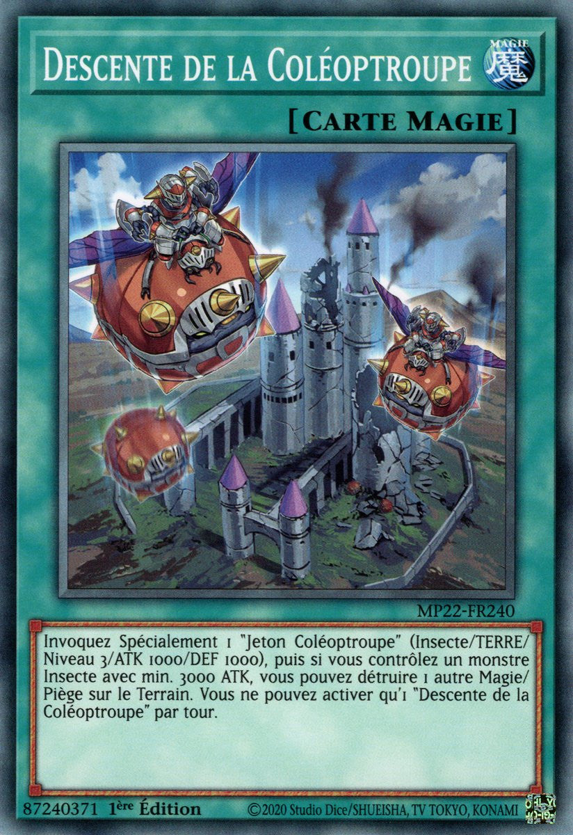 Invoquez Spécialement 1 "Jeton Coléoptroupe" (Insecte/TERRE/Niveau 3/ATK 1000/DEF 1000), puis si vous contrôlez un monstre Insecte avec min. 3000 ATK, vous pouvez détruire 1 autre Magie/Piège sur le Terrain. Vous ne pouvez activer qu'1 "Descente de la Coléoptroupe" par tour.