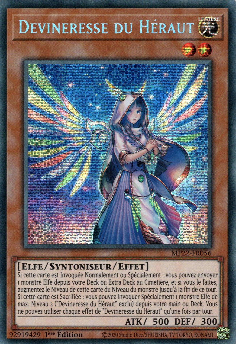 Si cette carte est Invoquée Normalement ou Spécialement : vous pouvez envoyer 1 monstre Elfe depuis votre Deck ou Extra Deck au Cimetière, et si vous le faites, augmentez le Niveau de cette carte du Niveau du monstre jusqu'à la fin de ce tour. Si cette carte est Sacrifiée : vous pouvez Invoquer Spécialement 1 monstre Elfe de max. Niveau 2 ("Devineresse du Héraut" exclu) depuis votre main ou Deck. Vous ne pouvez utiliser chaque effet de "Devineresse du Héraut" qu'une fois par tour.