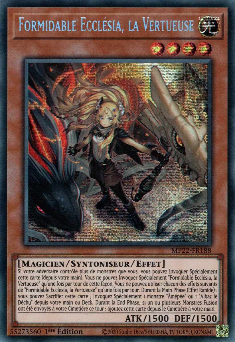 Si votre adversaire contrôle plus de monstres que vous, vous pouvez Invoquer Spécialement cette carte (depuis votre main). Vous ne pouvez Invoquer Spécialement "Formidable Ecclésia, la Vertueuse" qu'une fois par tour de cette façon. Vous ne pouvez utiliser chacun des effets suivants de "Formidable Ecclésia, la Vertueuse" qu'une fois par tour. Durant la Main Phase (Effet Rapide) : vous pouvez Sacrifier cette carte ; Invoquez Spécialement 1 monstre "Âmépée" ou 1 "Albaz le Déchu" depuis votre main ou Deck. Durant la End Phase, si un ou plusieurs Monstres Fusion ont été envoyés à votre Cimetière ce tour : ajoutez cette carte depuis le Cimetière à votre main.