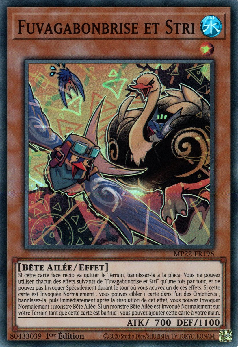 Si cette carte face recto va quitter le Terrain, bannissez-la à la place. Vous ne pouvez utiliser chacun des effets suivants de "Fuvagabonbrise et Stri" qu'une fois par tour, et ne pouvez pas Invoquer Spécialement durant le tour où vous activez un de ces effets. Si cette carte est Invoquée Normalement : vous pouvez cibler 1 carte dans l'un des Cimetières ; bannissez-la, puis immédiatement après la résolution de cet effet, vous pouvez Invoquer Normalement 1 monstre Bête Ailée. Si un monstre Bête Ailée est Invoqué Normalement sur votre Terrain tant que cette carte est bannie : vous pouvez ajouter cette carte à votre main.