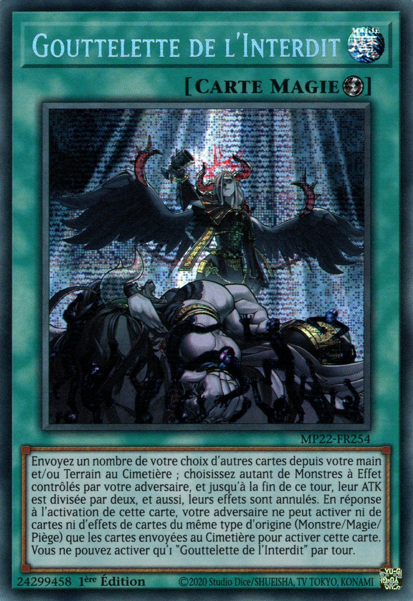 Envoyez un nombre de votre choix d'autres cartes depuis votre main et/ou Terrain au Cimetière ; choisissez autant de Monstres à Effet contrôlés par votre adversaire, et jusqu'à la fin de ce tour, leur ATK est divisée par deux, et aussi, leurs effets sont annulés. En réponse à l'activation de cette carte, votre adversaire ne peut activer ni de cartes ni d'effets de cartes du même type d'origine (Monstre/Magie/Piège) que les cartes envoyées au Cimetière pour activer cette carte. Vous ne pouvez activer qu'1 "Gouttelette de l'Interdit" par tour.