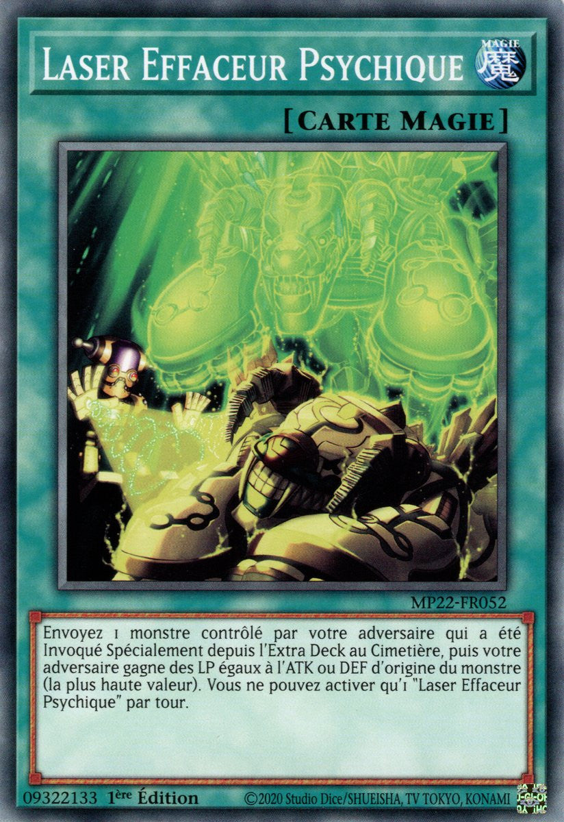 Envoyez 1 monstre contrôlé par votre adversaire qui a été Invoqué Spécialement depuis l'Extra Deck au Cimetière, puis votre adversaire gagne des LP égaux à l'ATK ou DEF d'origine du monstre (la plus haute valeur). Vous ne pouvez activer qu'1 "Laser Effaceur Psychique" par tour.