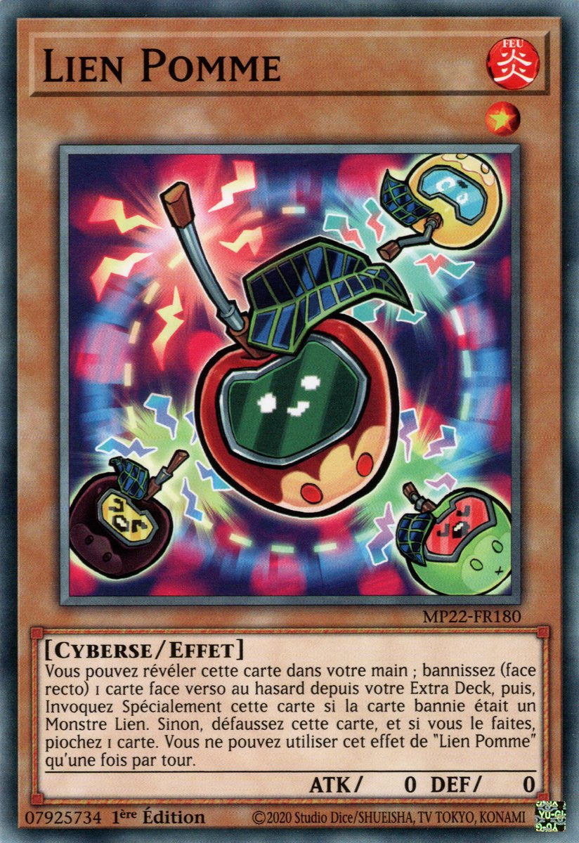 Vous pouvez révéler cette carte dans votre main ; bannissez (face recto) 1 carte face verso au hasard depuis votre Extra Deck, puis, Invoquez Spécialement cette carte si la carte bannie était un Monstre Lien. Sinon, défaussez cette carte, et si vous le faites, piochez 1 carte. Vous ne pouvez utiliser cet effet de "Lien Pomme" qu'une fois par tour.