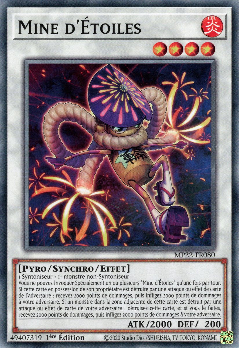 Vous ne pouvez Invoquer Spécialement un ou plusieurs "Mine d'Étoiles" qu'une fois par tour. Si cette carte en possession de son propriétaire est détruite par une attaque ou effet de carte de l'adversaire : recevez 2000 points de dommages, puis infligez 2000 points de dommages à votre adversaire. Si un monstre dans la zone adjacente de cette carte est détruit par une attaque ou effet de carte de votre adversaire : détruisez cette carte, et si vous le faites, recevez 2000 points de dommages, puis infligez 2000 points de dommages à votre adversaire.