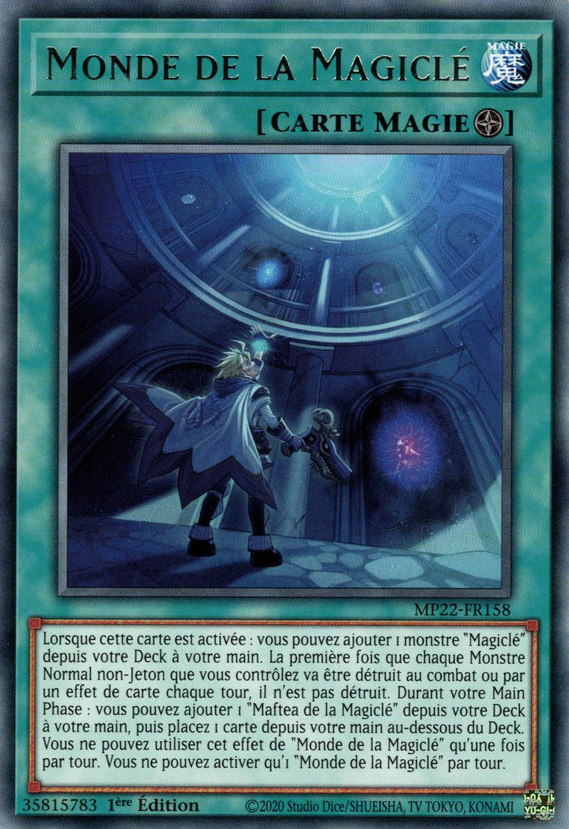 Lorsque cette carte est activée : vous pouvez ajouter 1 monstre "Magiclé" depuis votre Deck à votre main. La première fois que chaque Monstre Normal non-Jeton que vous contrôlez va être détruit au combat ou par un effet de carte chaque tour, il n'est pas détruit. Durant votre Main Phase : vous pouvez ajouter 1 "Maftea de la Magiclé" depuis votre Deck à votre main, puis placez 1 carte depuis votre main au-dessous du Deck. Vous ne pouvez utiliser cet effet de "Monde de la Magiclé" qu'une fois par tour. Vous ne pouvez activer qu'1 "Monde de la Magiclé" par tour.