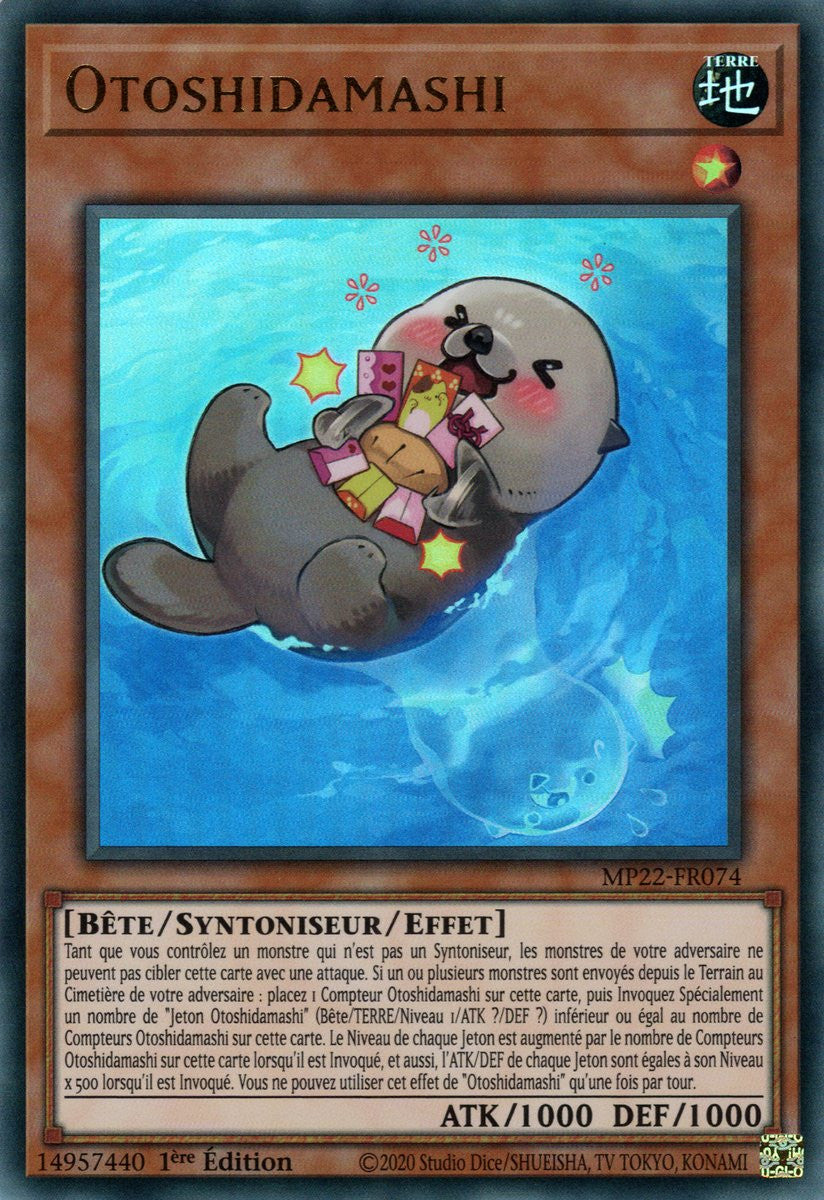 Tant que vous contrôlez un monstre qui n'est pas un Syntoniseur, les monstres de votre adversaire ne peuvent pas cibler cette carte avec une attaque. Si un ou plusieurs monstres sont envoyés depuis le Terrain au Cimetière de votre adversaire : placez 1 Compteur Otoshidamashi sur cette carte, puis Invoquez Spécialement un nombre de "Jeton Otoshidamashi" (Bête/TERRE/Niveau 1/ATK ?/DEF ?) inférieur ou égal au nombre de Compteurs Otoshidamashi sur cette carte. Le Niveau de chaque Jeton est augmenté par le nombre de Compteurs Otoshidamashi sur cette carte lorsqu'il est Invoqué, et aussi, l'ATK/DEF de chaque Jeton sont égales à son Niveau x 500 lorsqu'il est Invoqué. Vous ne pouvez utiliser cet effet de "Otoshidamashi" qu'une fois par tour.