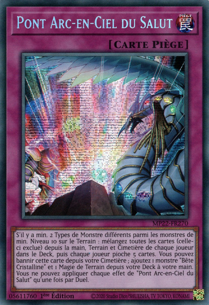 S'il y a min. 2 Types de Monstre différents parmi les monstres de min. Niveau 10 sur le Terrain : mélangez toutes les cartes (celle-ci exclue) depuis la main, Terrain et Cimetière de chaque joueur dans le Deck, puis chaque joueur pioche 5 cartes. Vous pouvez bannir cette carte depuis votre Cimetière ; ajoutez 1 monstre "Bête Cristalline" et 1 Magie de Terrain depuis votre Deck à votre main. Vous ne pouvez appliquer chaque effet de "Pont Arc-en-Ciel du Salut" qu'une fois par Duel.