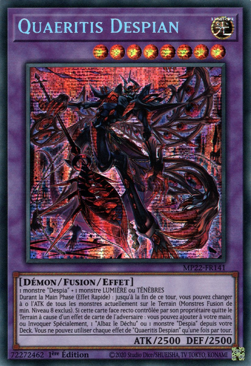 Durant la Main Phase (Effet Rapide) : jusqu'à la fin de ce tour, vous pouvez changer à 0 l'ATK de tous les monstres actuellement sur le Terrain (Monstres Fusion de min. Niveau 8 exclus). Si cette carte face recto contrôlée par son propriétaire quitte le Terrain à cause d'un effet de carte de l'adversaire : vous pouvez ajouter à votre main, ou Invoquer Spécialement, 1 "Albaz le Déchu" ou 1 monstre "Despia" depuis votre Deck. Vous ne pouvez utiliser chaque effet de "Quaeritis Despian" qu'une fois par tour.