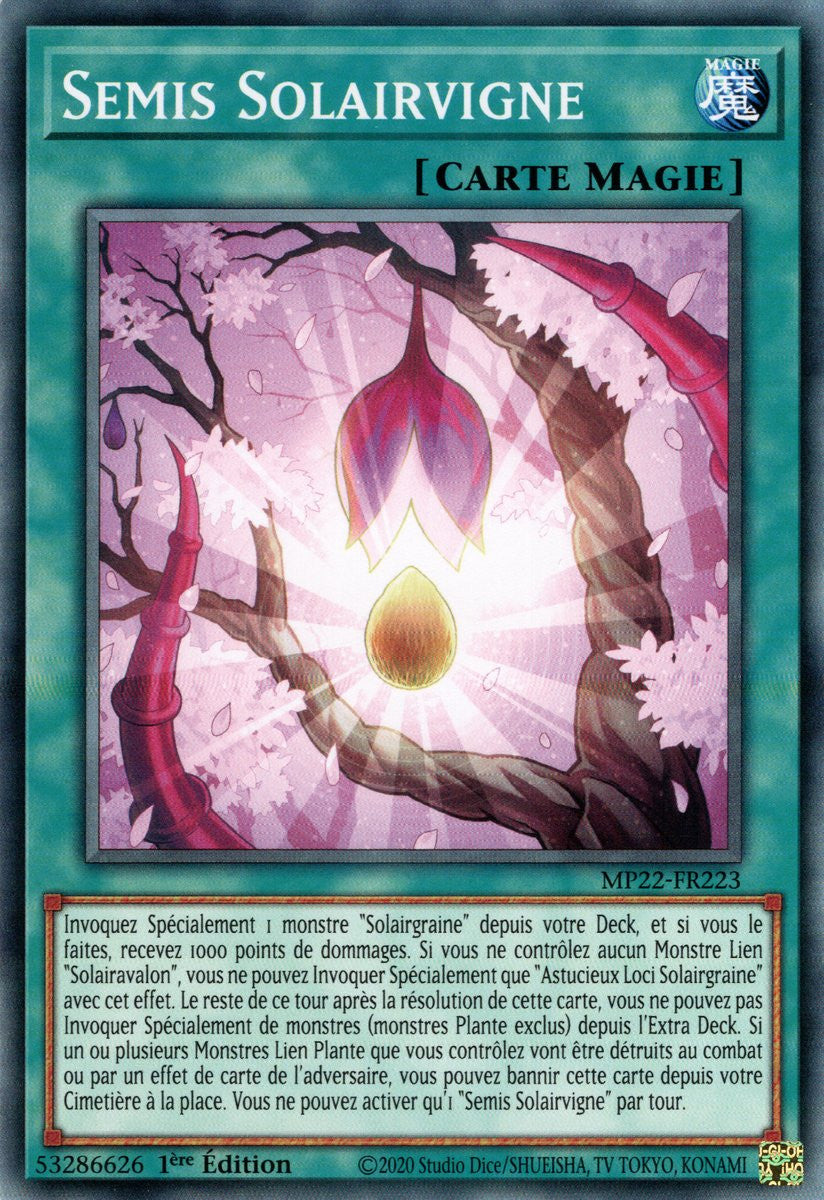 Invoquez Spécialement 1 monstre "Solairgraine" depuis votre Deck, et si vous le faites, recevez 1000 points de dommages. Si vous ne contrôlez aucun Monstre Lien "Solairavalon", vous ne pouvez Invoquer Spécialement que "Astucieux Loci Solairgraine" avec cet effet. Le reste de ce tour après la résolution de cette carte, vous ne pouvez pas Invoquer Spécialement de monstres (monstres Plante exclus) depuis l'Extra Deck. Si un ou plusieurs Monstres Lien Plante que vous contrôlez vont être détruits au combat ou par un effet de carte de l'adversaire, vous pouvez bannir cette carte depuis votre Cimetière à la place. Vous ne pouvez activer qu'1 "Semis Solairvigne" par tour.