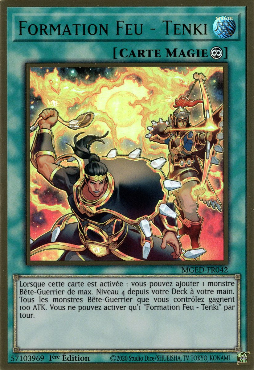 Lorsque cette carte est activée : vous pouvez ajouter 1 monstre Bête-Guerrier de max. Niveau 4 depuis votre Deck à votre main. Tous les monstres Bête-Guerrier que vous contrôlez gagnent 100 ATK. Vous ne pouvez activer qu'1 "Formation Feu - Tenki" par tour.